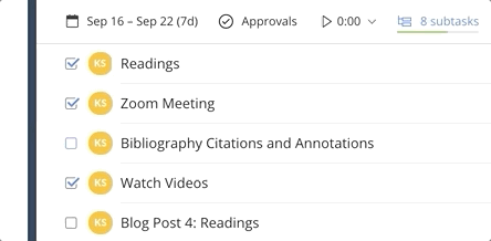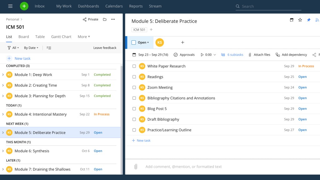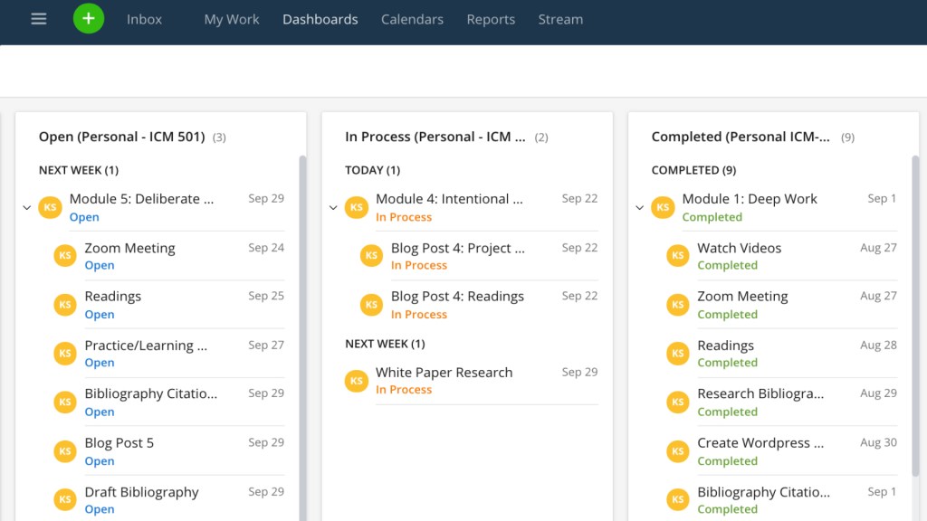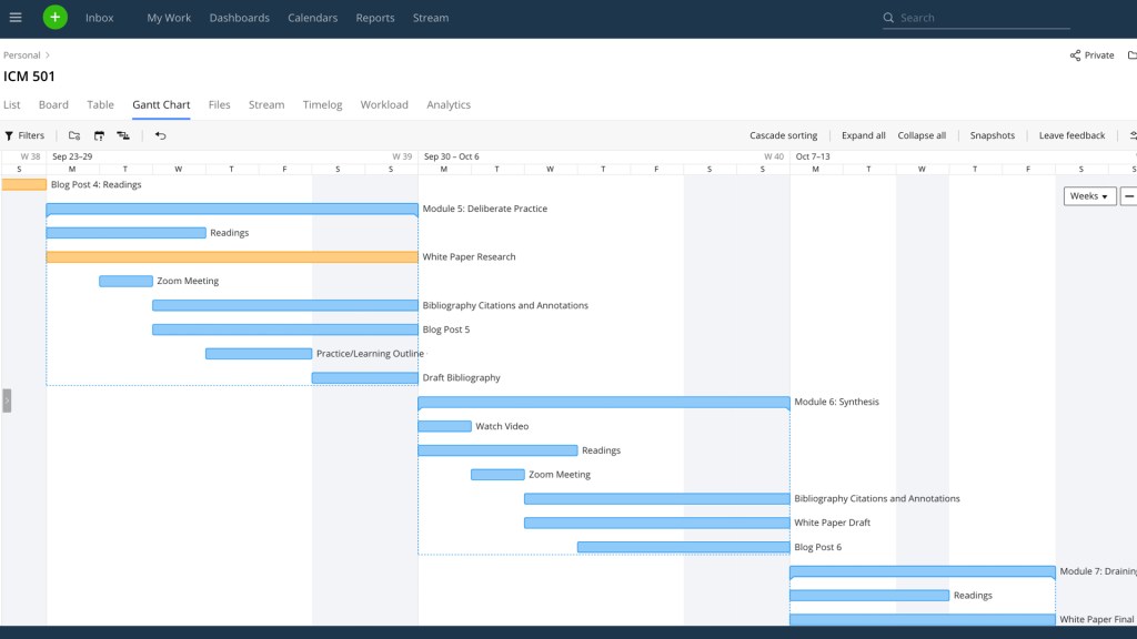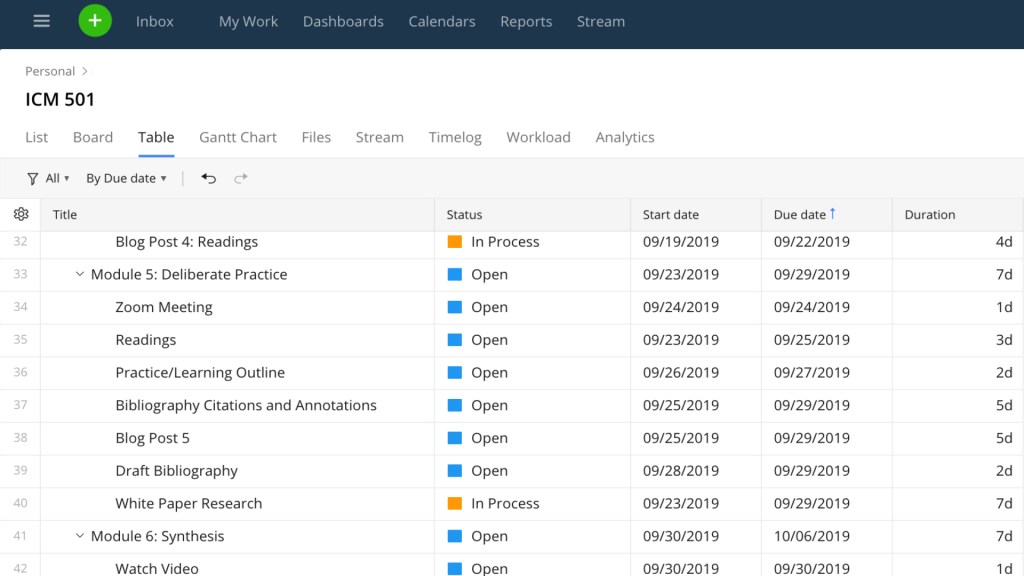 The Wrike workspace is organized into folders. For example, in my image above I’m showing you my Personal folder with a layout of the projects and subtasks for a current graduate class in which I’m enrolled. In my office we also have folders for different task types. As would be expected, I spend much of my day in the Social Media folder. I bring folders up because it’s the offering of the personal one that I find useful.