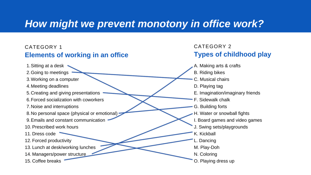 It requires that you create a “How Might We” statement about a specific problem for which you must think up solutions. When I tried the technique, I used the statement, “How might we prevent monotony in office work?”