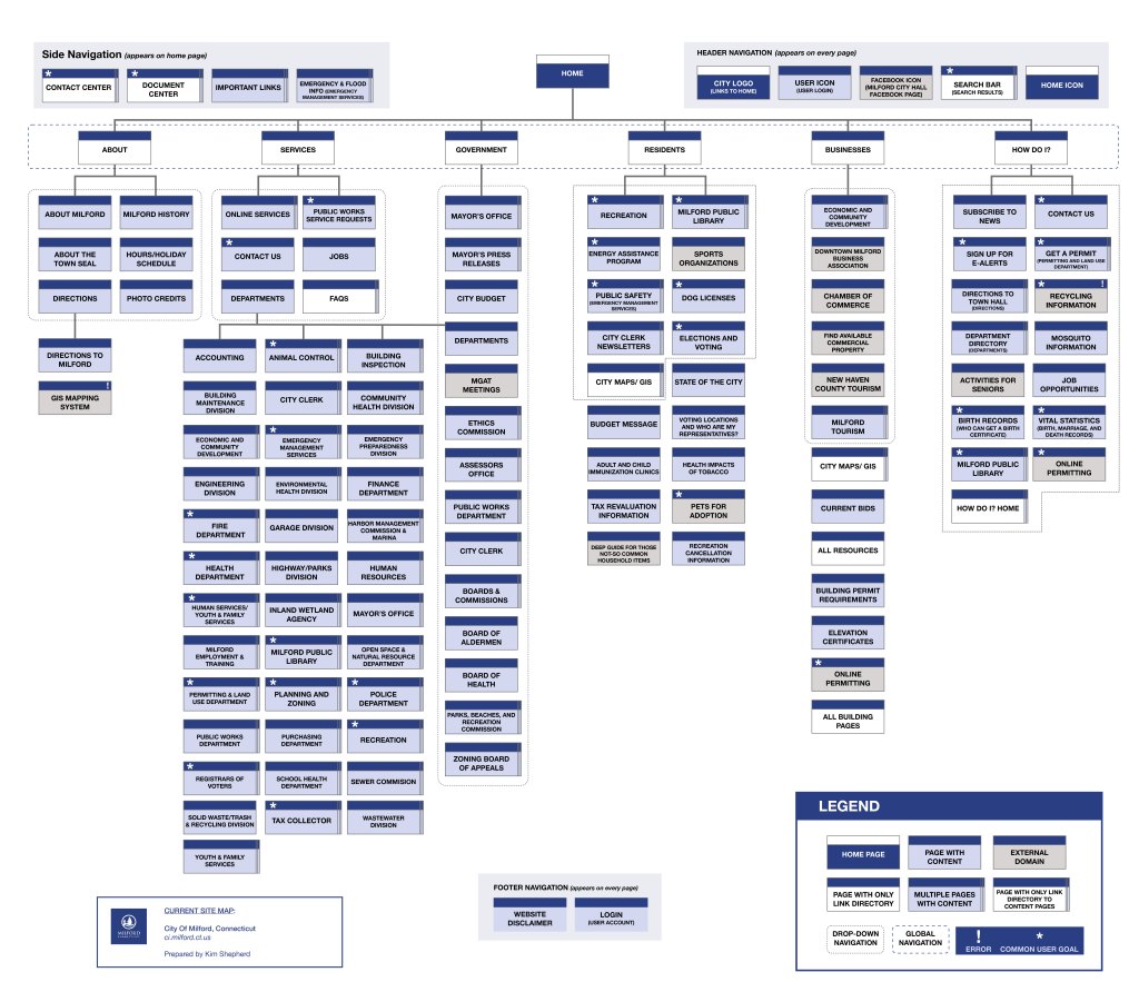 I created the site map below to show the current IA of the municipal website for my city of Milford, Connecticut. Government websites are notoriously bad. Although there is little we can do to cure the scourge of bureaucratic legalese that dominates their content or the lack of funding for more modern UI design, IA is something that a little investment in can have a very high impact.