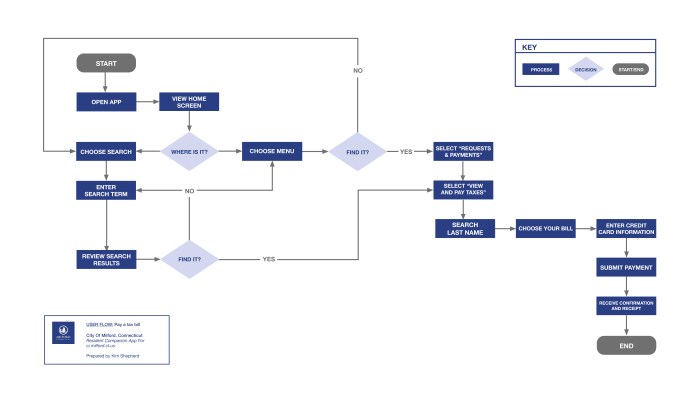 In a previous post, I explained how I designed the information architecture of a resident companion app for my city’s municipal website, which is aimed at being an on-the-go resource for residents. Using the app’s site map, the visual depiction of its IA design, I’ve created 3 user flows.