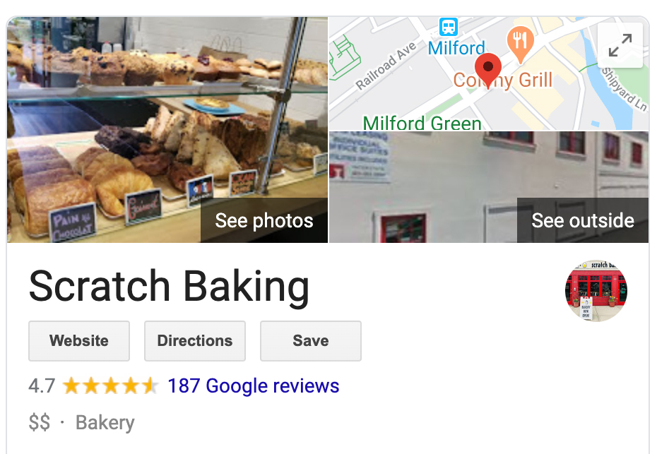 Once again, not super exciting, but vital. This is what determines the information users are fed about your business in Google searches. Over 90% of searches in the U.S. are done through Google. So, the demographics here are pretty much everyone, or at least everyone who could ever care about finding a bakery in Milford, CT. Scratch has all its information correct here, a number of photos, and a 4.7-star rating gained from 187 reviews. Also when searching “bakery in Milford, CT” Scratch’s listing comes first, ahead of multiple competitors. Scratch is winning the local Google game.