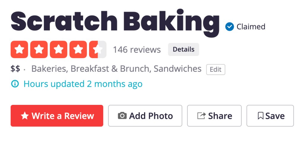 Yelp is not the most exciting platform, but good reviews here can help significantly with a small business’ success. The great news for Scratch is that the demographics for Yelp users align well with its audience. This probably explains why the bakery has received almost 150 reviews and has a 4.5-star rating.