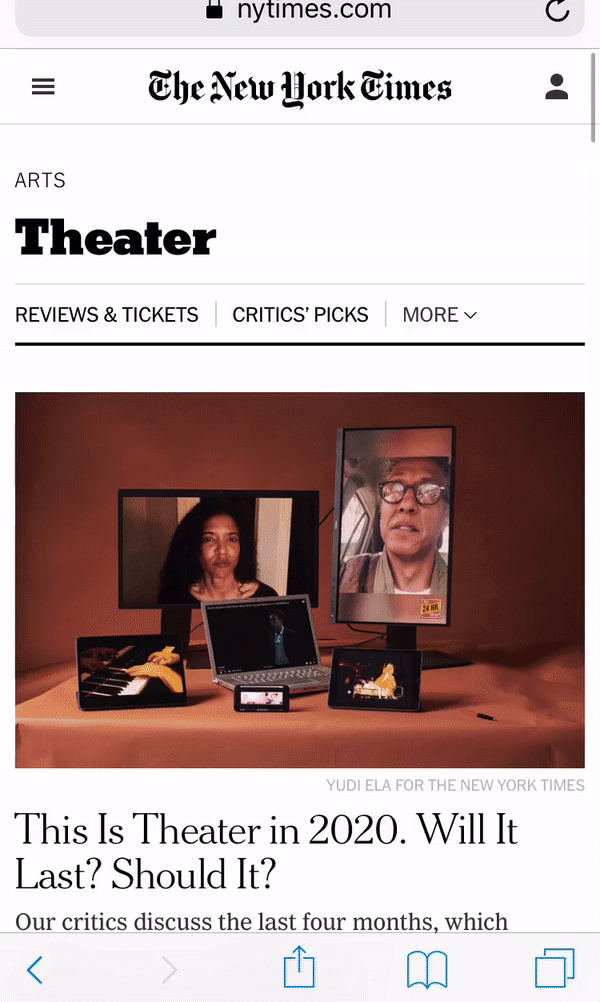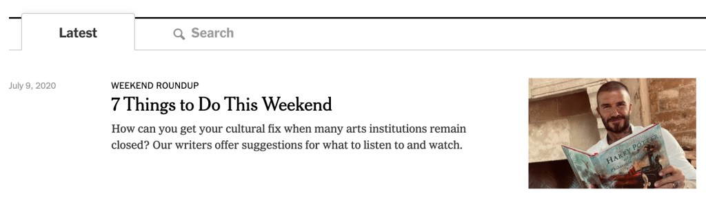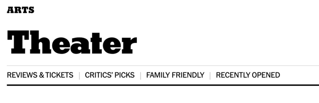 The labels in the top menu for this section of the website are clear in what type of content I will find under each. My only complaint is they don’t appear beyond the section’s homepage on article pages. The search options here are probably the standout feature. I have access to the search function that will give results for the whole New York Times website, but there’s also a dedicated search for just recently published theatre articles further down the page. Since this is the main reason most users visit this section it feels very supportive of their goals.
