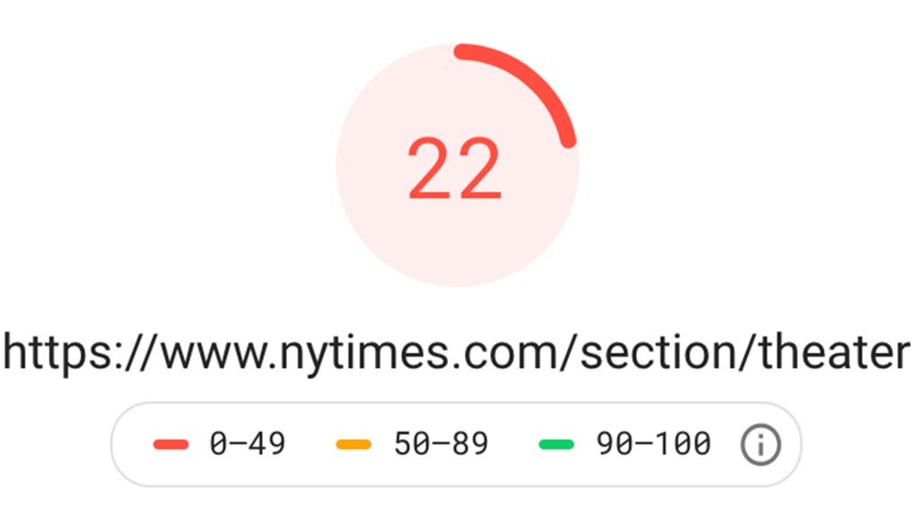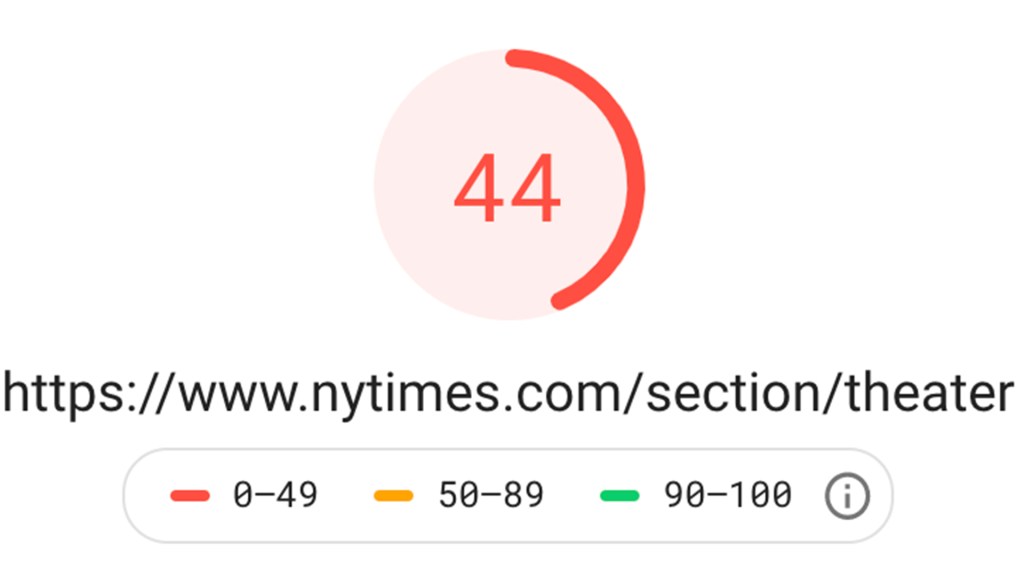 When I compared loading the site on desktop versus on my phone there was a clear lag on my phone of at least 3-5 seconds compared to desktop. Google PageSpeed Insights ranked the sections’ homepage 22 out of 100 on mobile and 44 out of 100 on desktop. Although this is slightly better than BroadwayWorld, it’s still not even close to optimal in Google’s eyes.