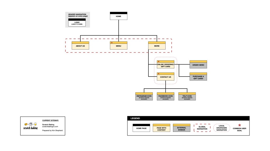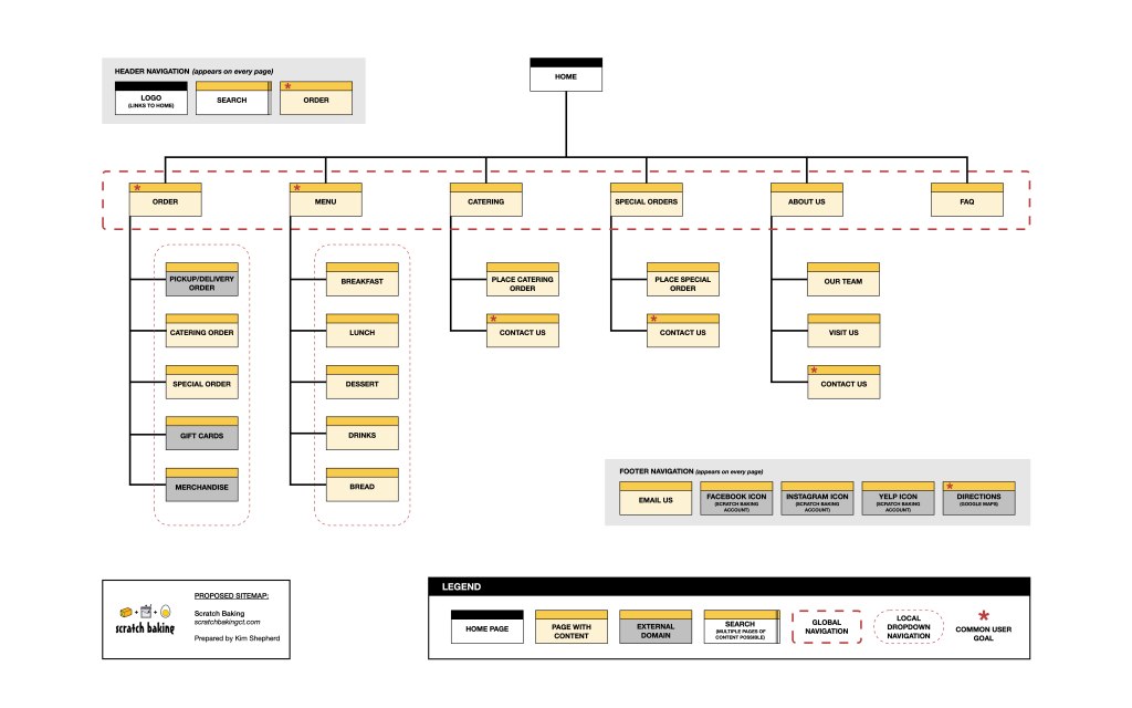 I’ve previously used one of my favorite small businesses – Scratch Baking – to talk about social media strategy. In doing so, I’ve noticed that their website isn’t really designed the best, especially in terms of navigation and pages offered. The sitemap below is their current site and if you look at it you can tell it’s pretty simple – perhaps too simple – even for a small bake shop.