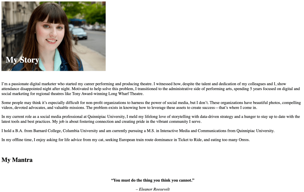 First, I identified which tag needed to be used to correctly define each piece of content on my page. I used a <h1> for the top heading on my page – “My Story” – because hierarchically it’s the most important heading on the page. The next heading – “My Mantra” – was labeled as a <h2> because it was of less importance. Note that there can only be one <h1> on a page, but multiples of any other heading such as <h2>. The body copy of my bio was labeled with <p> for paragraph and my photo was labeled with <img> for image.